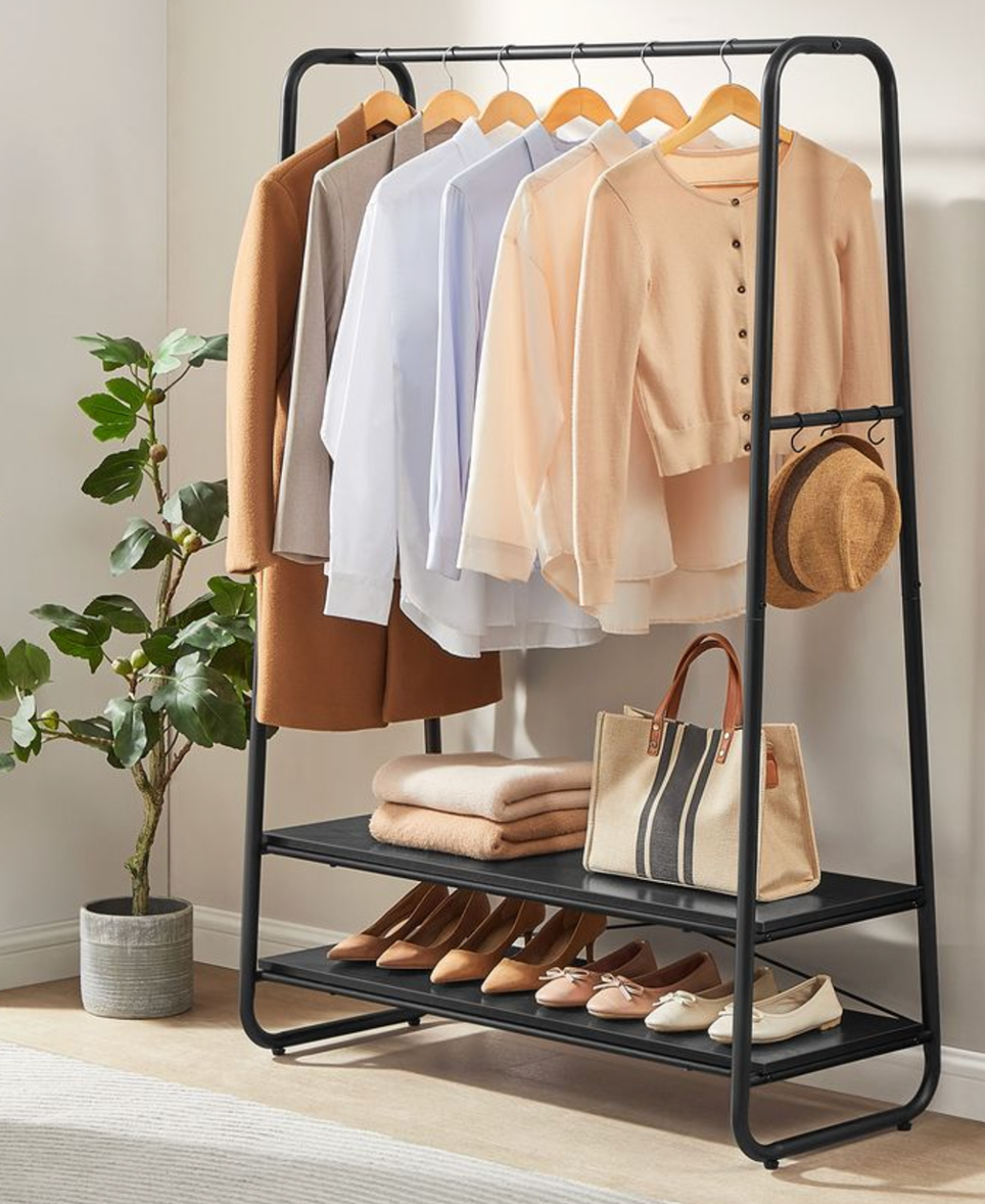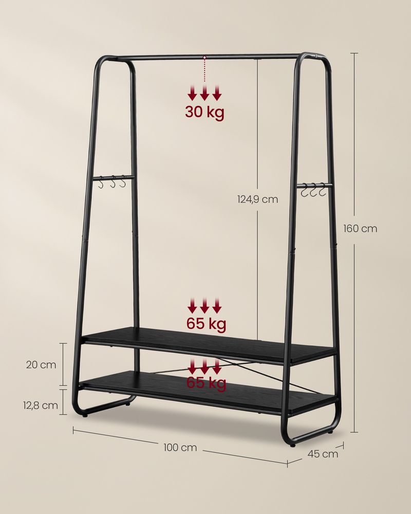 Garderobestativ med 2 skohylder og bøjlestang 100 cm sort