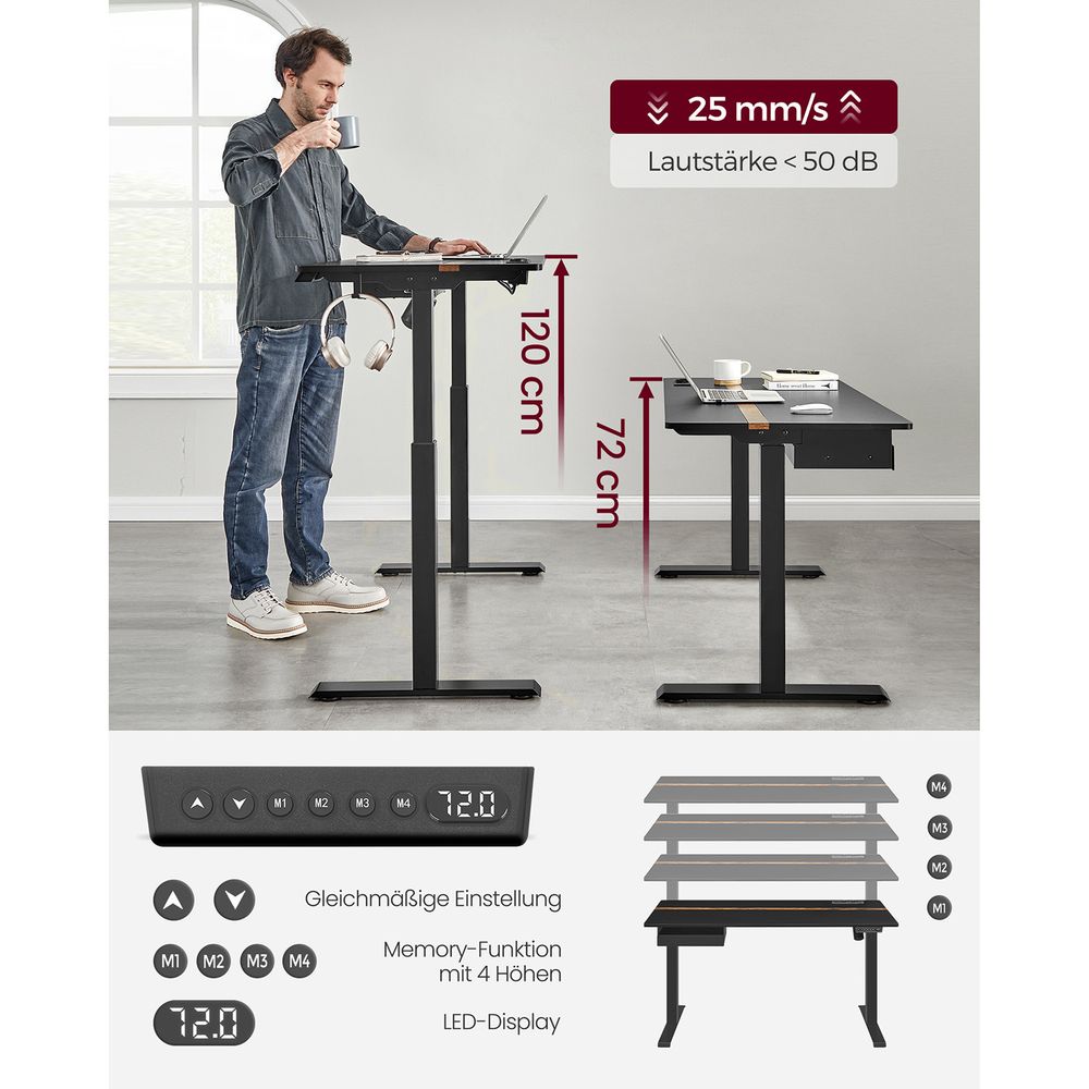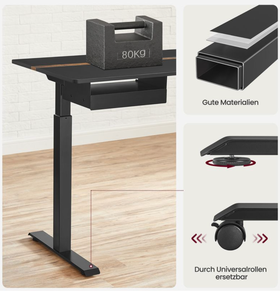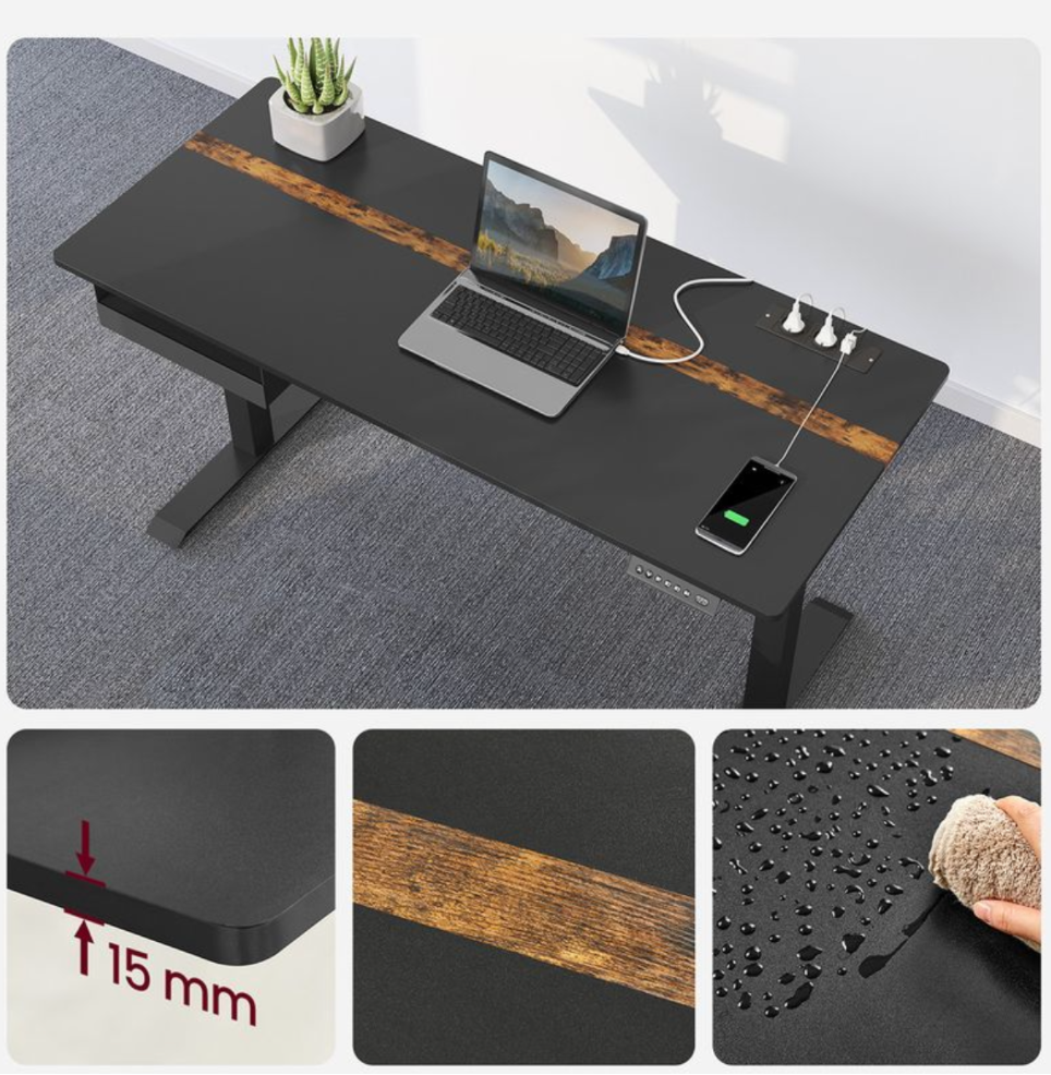 Hæve sænkebord 140 x 60 cm sort med USB stik og strømstik. Her får du muligheden for både at arbejde siddende eller stående. Industrielt enkelt og stilrent look på dette meget populære skrivebord med hæve og sænkefunktion. Bordpladen er udstyret med glatte kanter for at undgå ridser. Denne model er med integreret strømstik og USB stik.