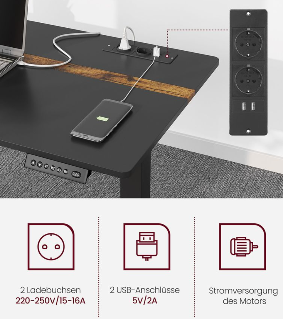 - Indbygget stikkontakt og integreret kabelføring – Med 2 opladningsstik og 2 USB-porte; takket være den integrerede kabelføring er det kun nødvendigt med ét kabel for at tilslutte strømmen til motoren og oplade din mobiltelefon eller andre enheder sammen