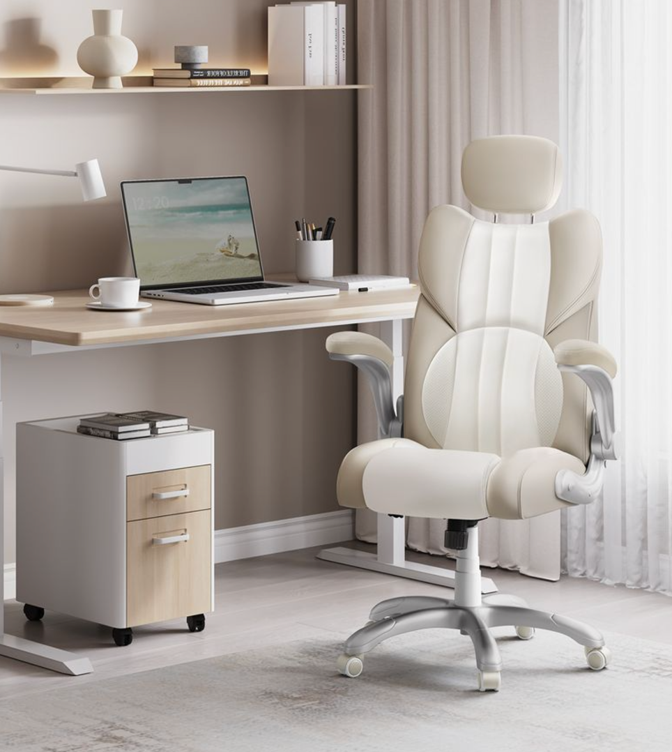 Kontorstol med klapsammen armlæn cremehvid. Juster højden på sædet og nakkestøtten (3-trins justerbar) for at finde den ideelle siddestilling til højden på din skærm. Det skumpolstrede sæde og det ergonomiske ryglæn sikrer større komfort under arbejdet. Vip stolen bagud med op til 20°. Denne funktion giver dig mulighed for at slappe af i et par minutter og derefter vende tilbage til arbejdet. Fold armlænene på denne kontorstol op, og skub stolen ind under skrivebordet for at spare plads.