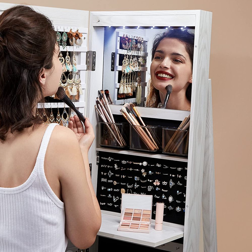 Smykkeskab med spejl og lys 162 cm hvid. Dette smykkeskab har et 37 x 155 cm stort rammeløst spejl i fuld længde. Masser af opbevaringsplads med 3 rum, 2 skuffer, 4 hylder og en lomme – så det er slut med kaos hvor dine smykker er henne. 6 LED-pærer oplyser dine smykker, når du åbner lågen. Et indvendigt spejl og en hængslet hylde til din makeup – det skaber et mini toiletbord, så du kan lægge din makeup, når skabsdøren åbnes.