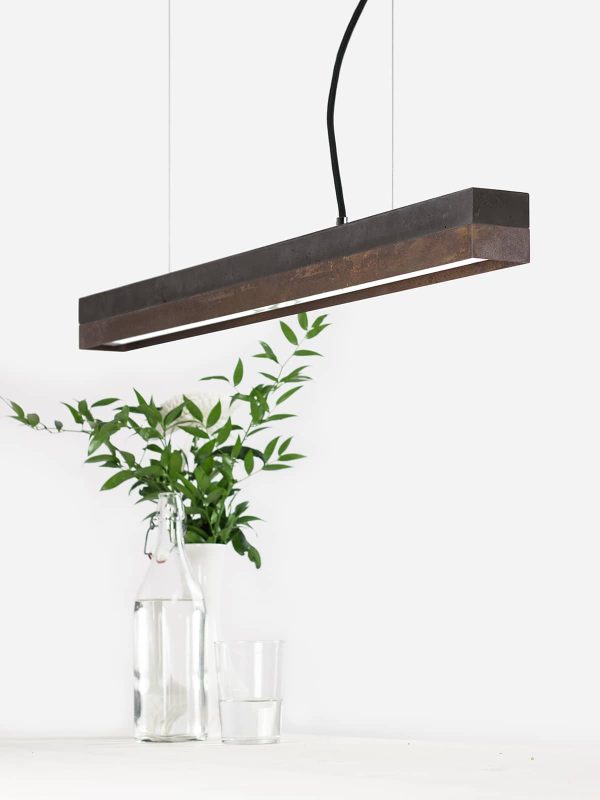Langbordspendel i beton og rusten stål. Langbordspendel i et råt og moderne design. Alle lamper kommer med indbygget dæmpbar LED lyskilde på 25W. Lampen er fremstillet i rusten stål og valgfri lys eller grå beton. Leveres standard med 2 meter sort stofledning. Du kan vælge 3 eller 5 meter stofledning samt grå eller hvid stofledning. Wirens længde følger valg af stoflednings længde.